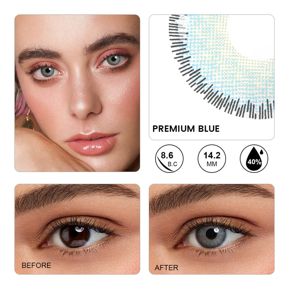 Premium Blue Contact Lenses offer a stunning, bright look with their light ocean blue hue and smaller pupil size. These lenses blend seamlessly with your natural eye color, creating a vibrant and captivating appearance.
